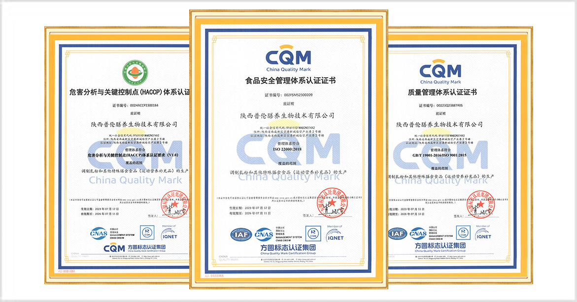 术厚邦源头厂家获得“食品安全管理体系、质量管理体系、良好生产规范(GMP)、危害分析与关键控制点(HACCP)”四大体系认证。同时获得了多项生物技术和生产领域的发明专利等知识产权。